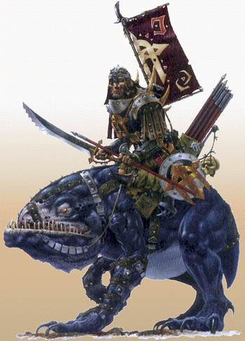 Unter den abstossensten der sterblichen Legionen der Lakaien sind die Blutjäger, Individuen, deren ganzes Wesen sie schon für den Dienst des Finsteren Fürsten prädestiniert. Sie dienen bereitwillig in den Reihen der Lakaien, nicht weil sie einem falschen, schrecklich pervertiertem Ideal nachfolgen, sondern weil es die Gier und Grausamkeit in ihrem Herzen befriedigt. Deshalb behalten die Blutjäger ihre verzerrte Menschlichkeit länger als alle anderen sterblichen Lakaien. Blutjäger erfreuen sich an Grausamkeiten und Schmerzen und dienen als Späher und Spurenleser in der Armee der Lakaien. Grausame Jäger und nur etwas weniger aasgeierhaft als die Höllenschwingen, erfreuen sich die Blutjäger am Plündern der Toten und Sterbenden und tragen die Kleidung ihrer Opfer wie morbide Trophäen.Als Belohnung für ihre Hingabe, versorgen ihre Dunklen Meister die Jäger mit Dämonenmären, die ihnen als Reittiere dienen und ihnen bei der Verfolgung der Ungläubigen helfen. Diese monströsen Reittiere scheinen langsam und dumm zu sein, dies ist jedoch nur ein weiterer grausamer Trick des Finsteren Fürsten. Sie sind zu schnellen Sprints fähig und ihr riesiges Maul ist mit rasiermesserscharfen Zähnen versehen, die mehr als nur in der Lage sind die Rüstung eines Erstgeborenen aufzubrechen. Blutjägergruppen werden von einem der Ihren geführt, der die anderen an Verkommenheit und Grausamkeit übertrifft. Wie bei allen Aasfressern kann dieser Anführer bei dem leichtesten Anzeichen von Schwäche durch einen anderen beseitigt werden.