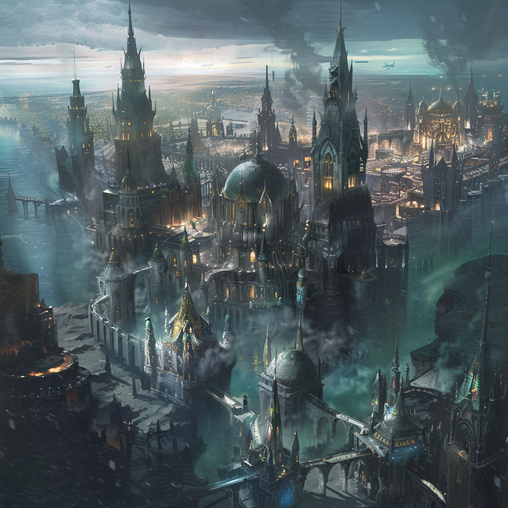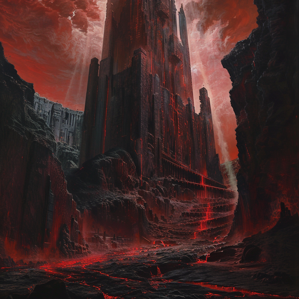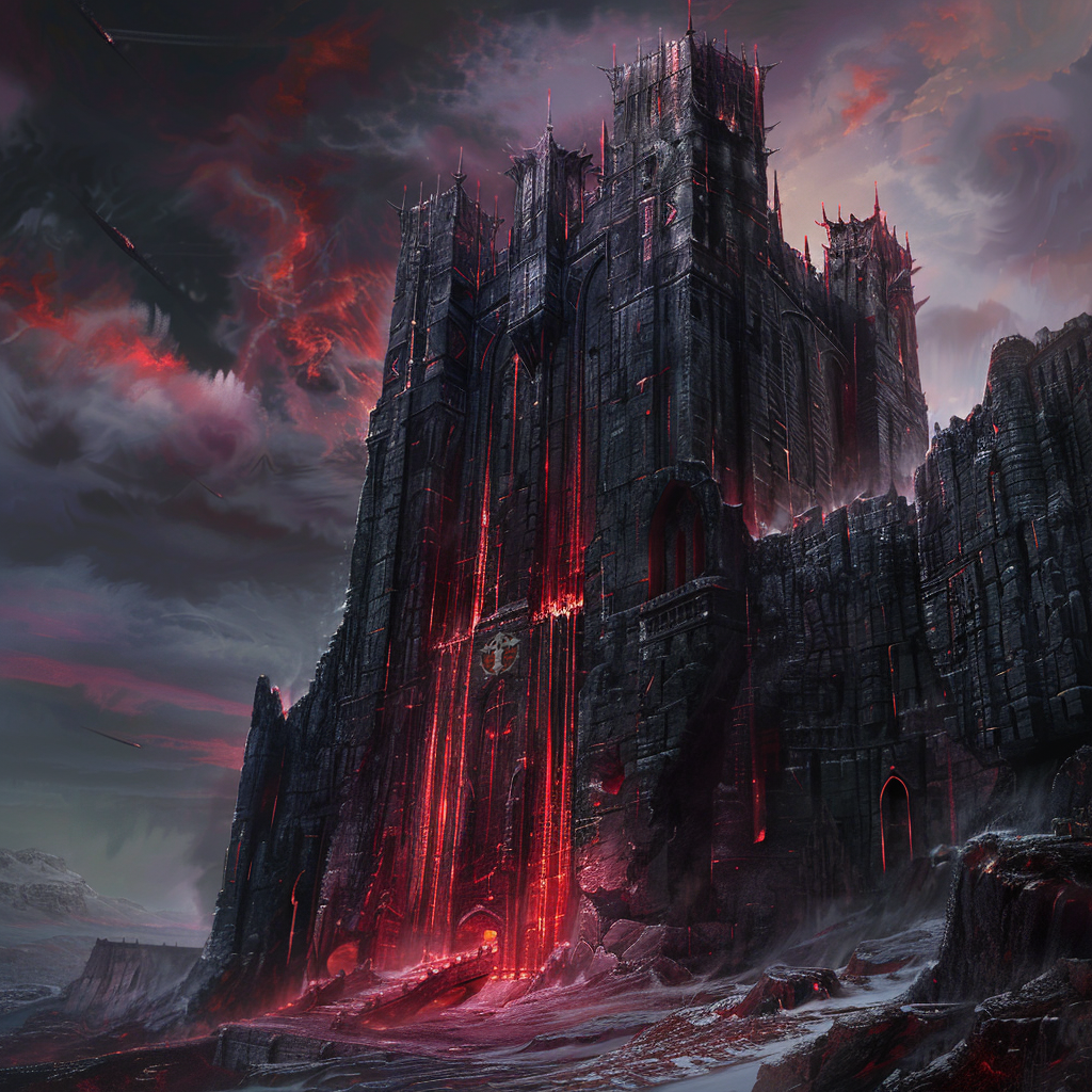 Siehe die Zitadelle, eine monolithische Festung aus schwarzem Marmor, durchzogen von unheilvollen Streifen blutroten Irisierens, die trotzig am äußersten Rand des Wirbels emporragt. Ihre kolossalen, glasigen Säulen ragen gen Himmel, eine Hommage an ihren bösartigen Herrscher.