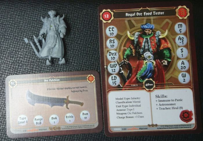 Diese seltenen und normalerweise kurzlebigen Individuen, die in einer in sich paranoiden Gesellschaft in die Kreise des höchsten Vertrauens aufsteigen, tragen den Ehrentitel des „Königlichen Vorkosters“. Diese Orks sind die ersten, die vom Wein ihres Meisters nippen, oder einen Bissen seines Essens kosten und dann ein wenig warten. Sollten sie sterben, werden im Hof Köpfe rollen, da es eine Verschwörung gegeben hat. Wenn nicht, kann der Königliche Vorkoster noch einen Tag der Intrigen genießen.Bilder