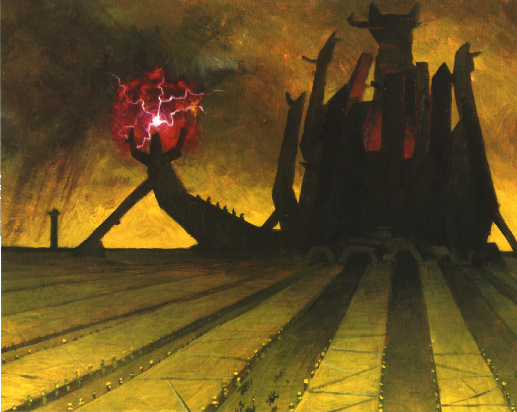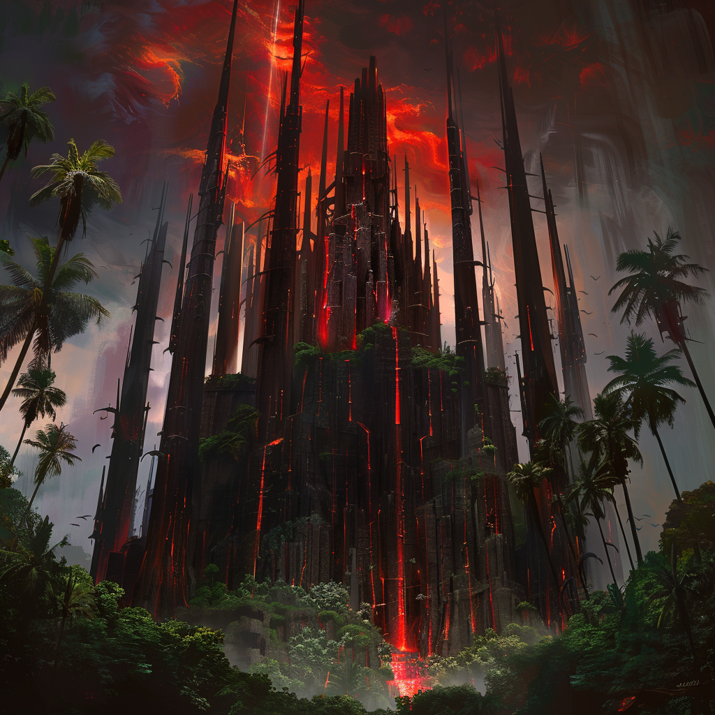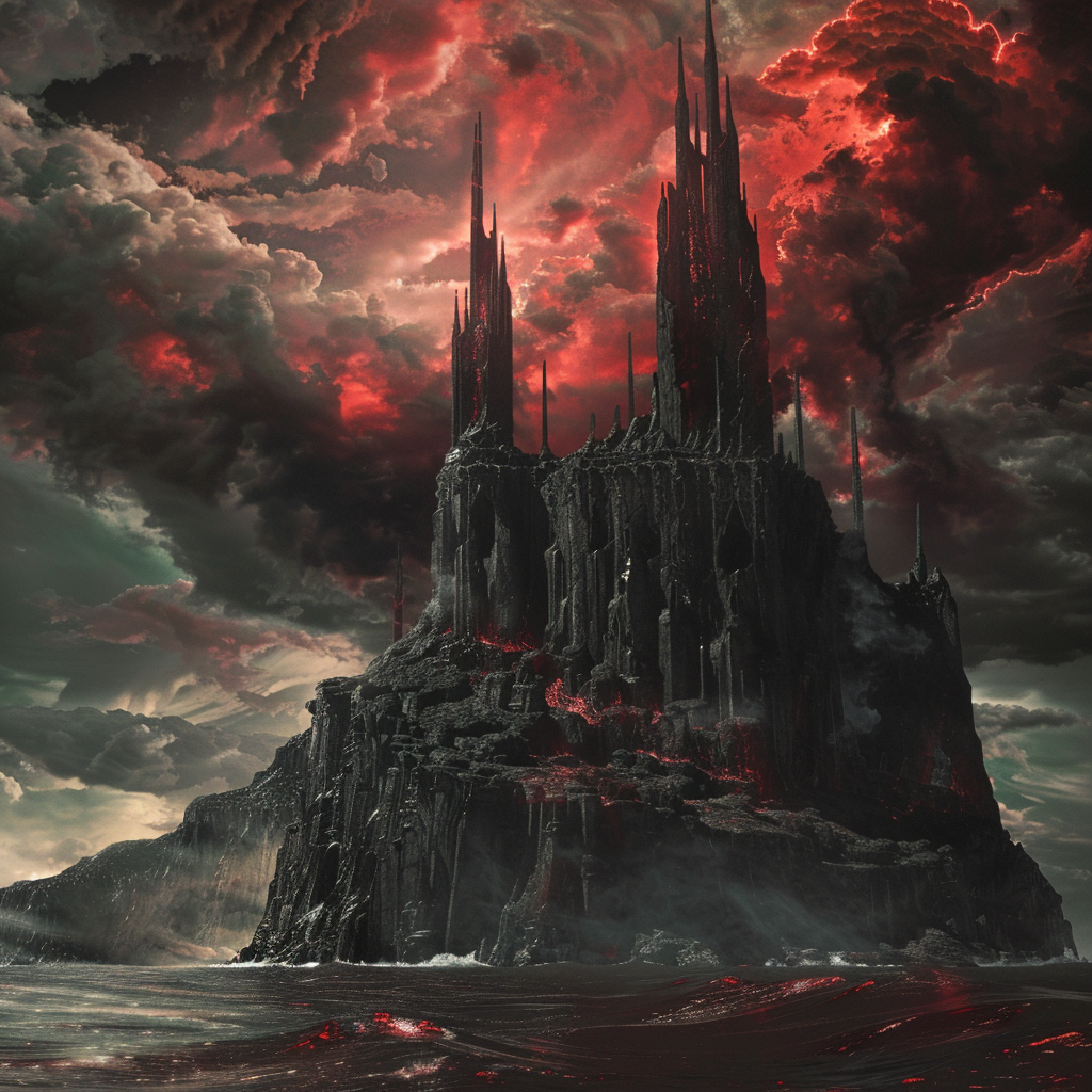 Siehe die Zitadelle, eine monolithische Festung aus schwarzem Marmor, durchzogen von unheilvollen Streifen blutroten Irisierens, die trotzig am äußersten Rand des Wirbels emporragt. Ihre kolossalen, glasigen Säulen ragen gen Himmel, eine Hommage an ihren bösartigen Herrscher.